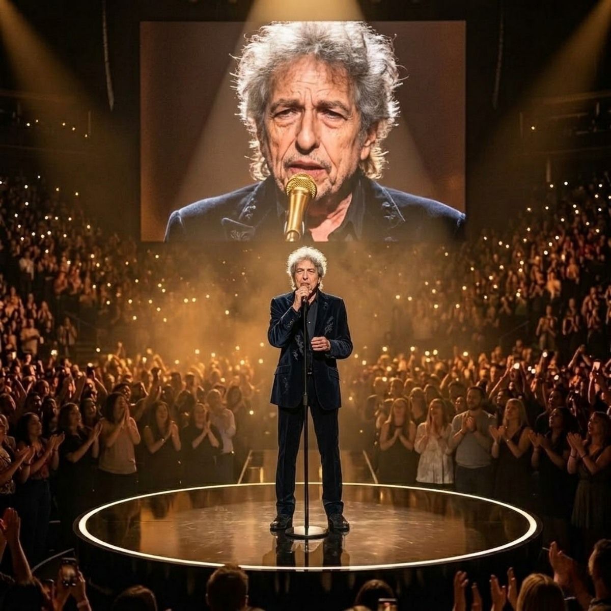 Witnesses say the atmosphere inside the arena was already electric before Dylan even appeared. When the lights finally dimmed and the legendary figure walked slowly toward the microphone, the audience erupted into cheers that echoed throughout the venue.